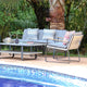 Rattan sintético (Fibra termoplática de alta calidad), Madera Teka, Cojines en tela Sunfiber (Poliéster teñido en masa).